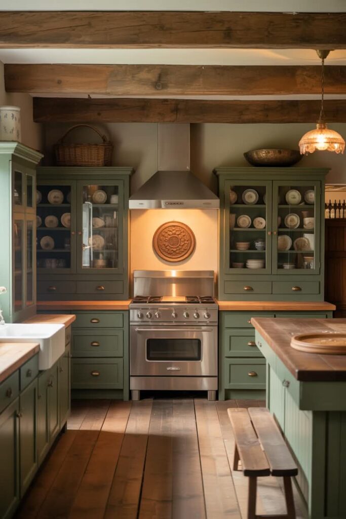 Jewel tones are cinematic but high-maintenance. Country kitchens breathe best in earth: clotted cream, oatmeal, sage, soot, and the red-brown that already lives in your floor. Then: a stripe of color that tells the room it’s alive. A peppering of blue-and-white china. A stack of green glass tumblers. A rug with a cranberry border that nods to the AGA you don’t own.